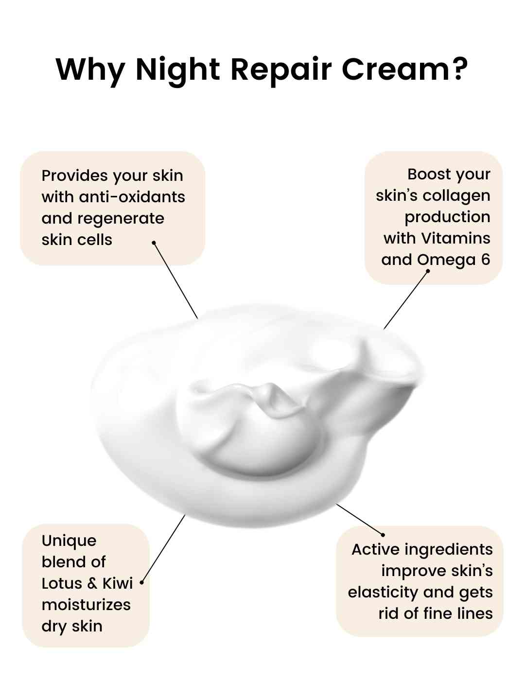 Our Night Repair Cream is a natural face cream that's perfect to apply after a tiring day for complete skin rejuvenation and nourishment. It's made with active ingredients that helps skin moisturize, hydrate, increase firmness, remove wrinkles and lift the skin.