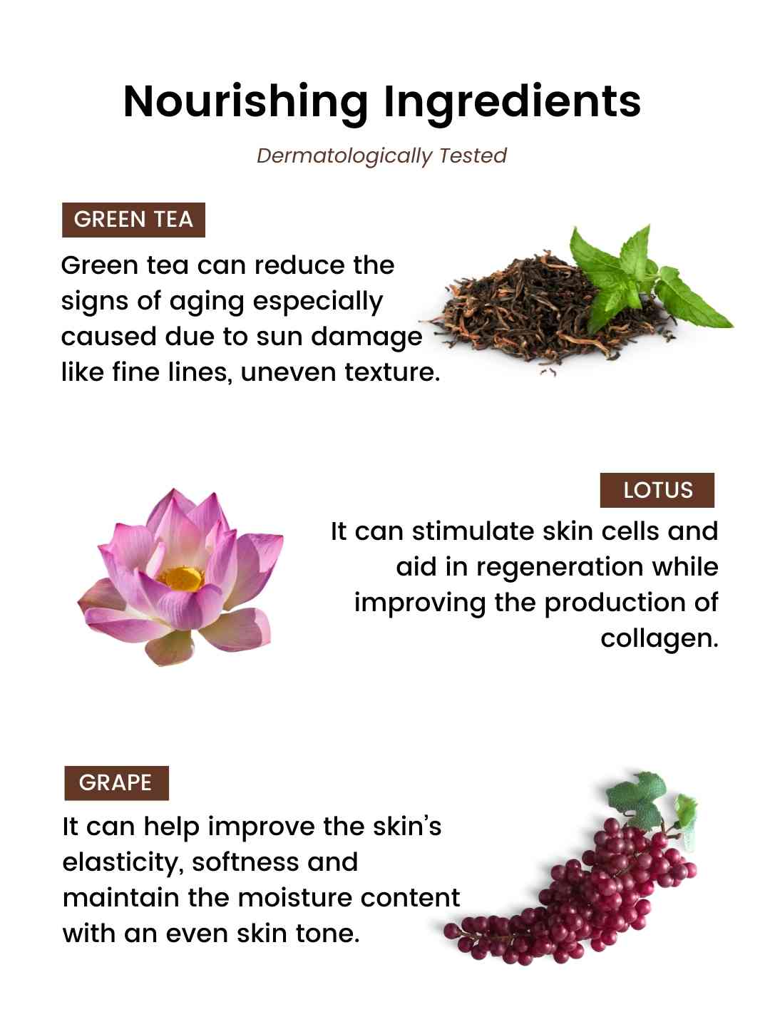 Green Tea is rich in antioxidants and help protect skin from free radicals caused by environmental stressors like UV radiation and pollution. It can promote DNA repair and help reduce the signs of aging especially caused due to sun damage like fine lines, uneven texture.
