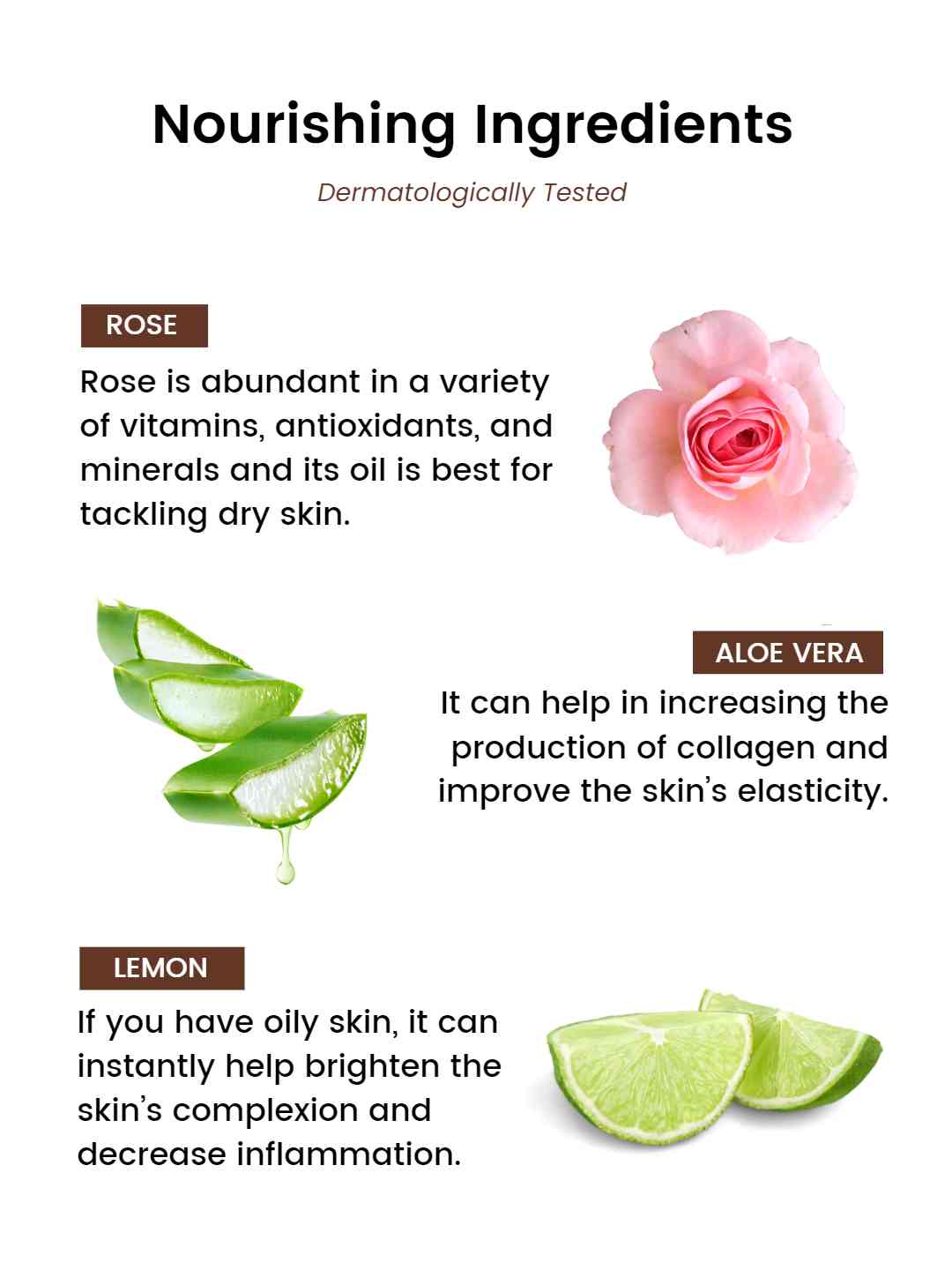 Rose, Aloe Vera and Citrus lemon gives the skin- natural toning and tightening. While, uplifting the skin and making the skin soft & glowing. The unique natural blends help in calming and soothing your skin. The lemon works magic on the skin by helping in decreasing the inflammation and oil on the skin that may contribute to acne formation.