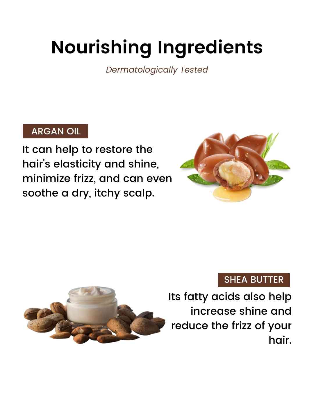 Argan Oil: It can help to restore the hair's elasticity and shine, minimize frizz, and can even soothe a dry, itchy scalp.