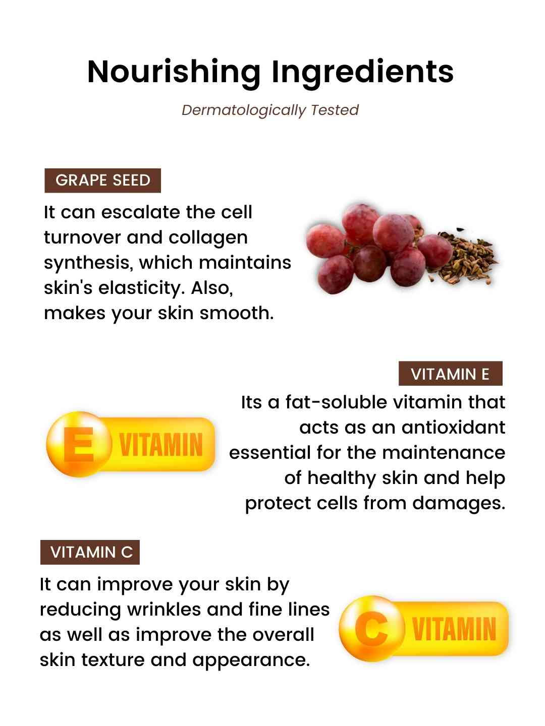 Grape Seed: It can escalate the cell turnover and collagen synthesis, which maintains skin's elasticity. Also, makes your skin smooth and more elastic.
